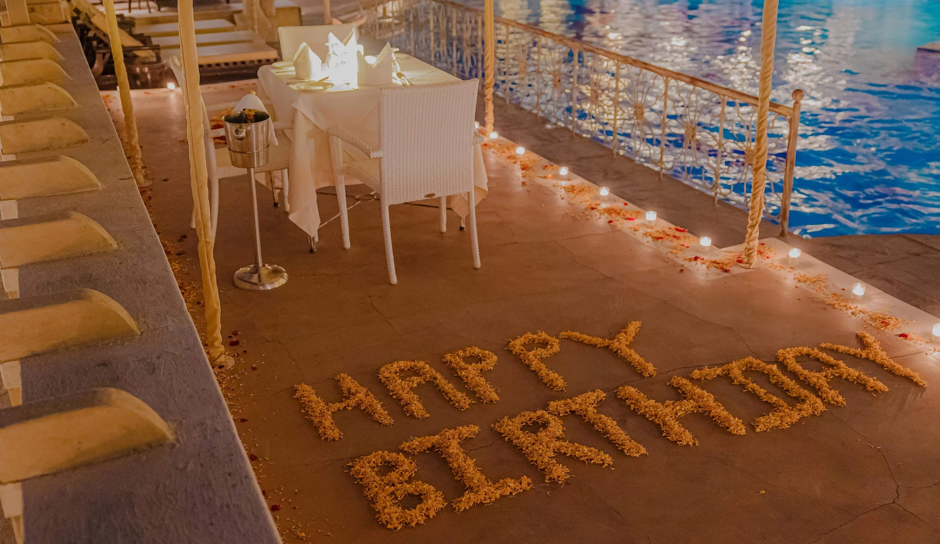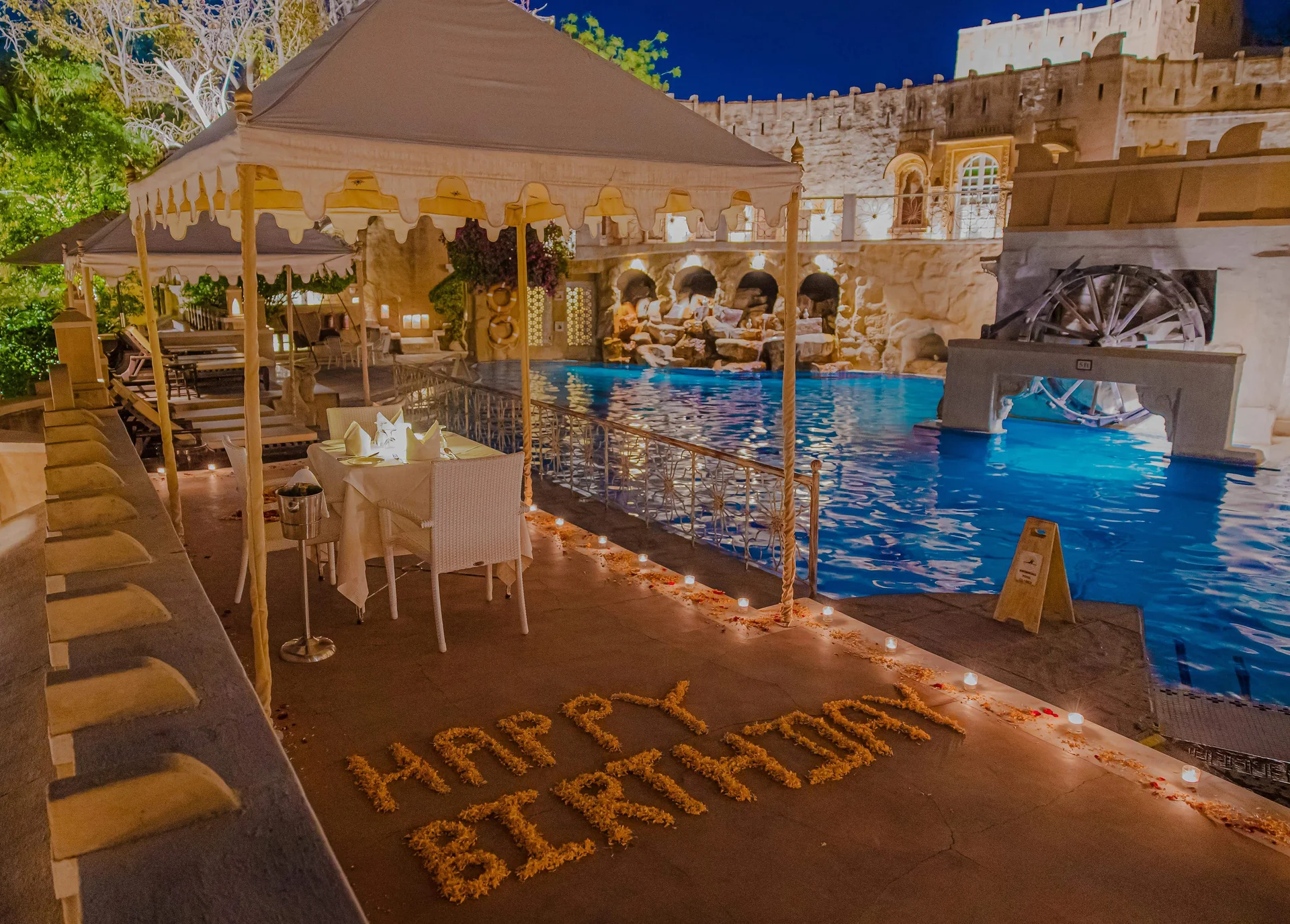 A serene area surrounding the pool, ideal for a relaxed Mehendi or Haldi ceremony with colorful decor.