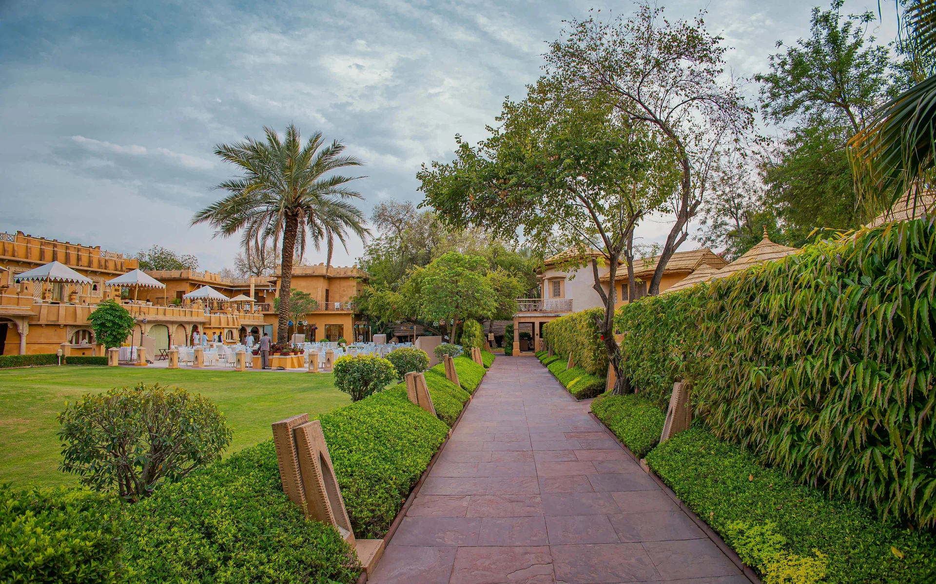 Beautifully manicured gardens with the red sandstone palace as a backdrop, perfect for an intimate evening reception.