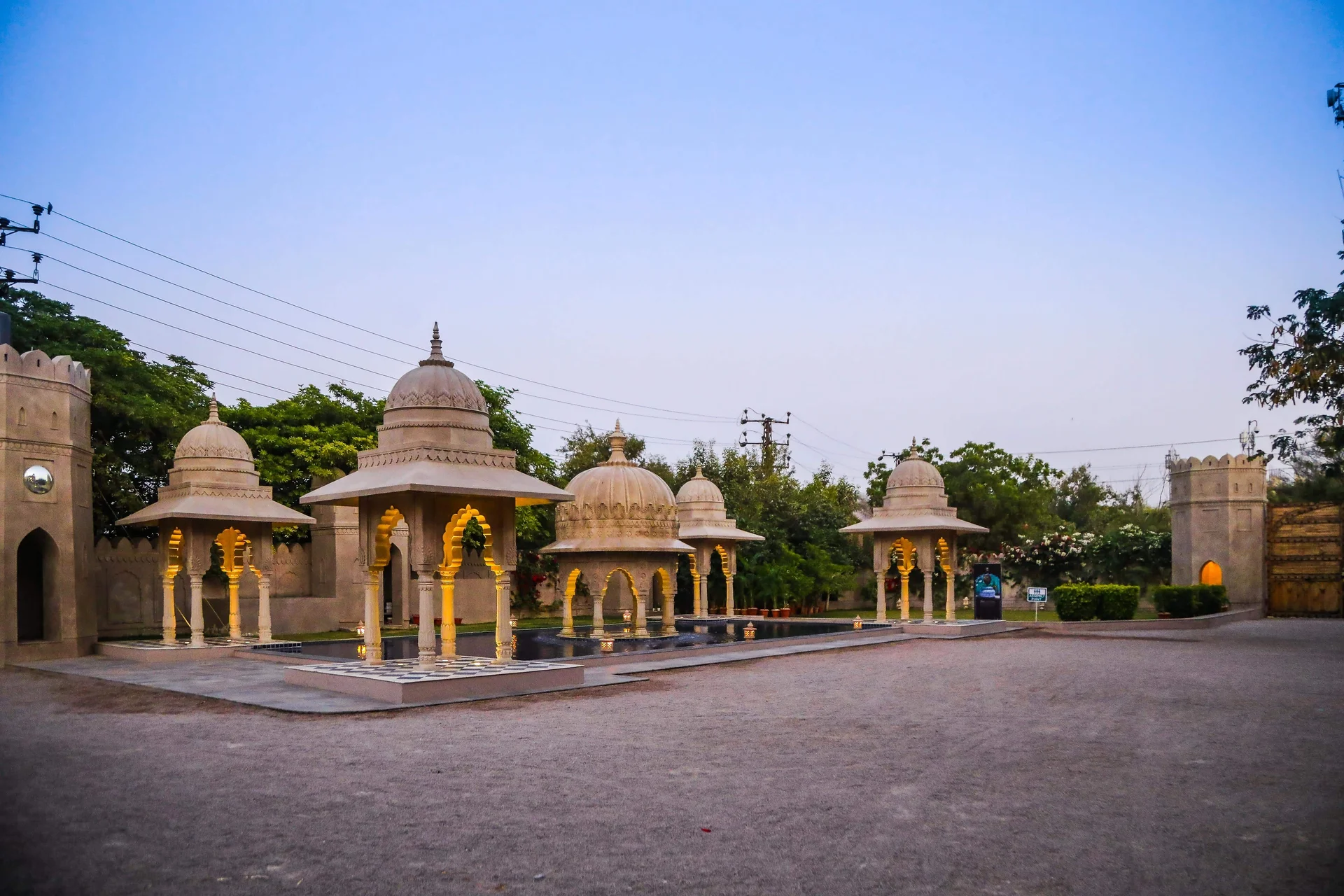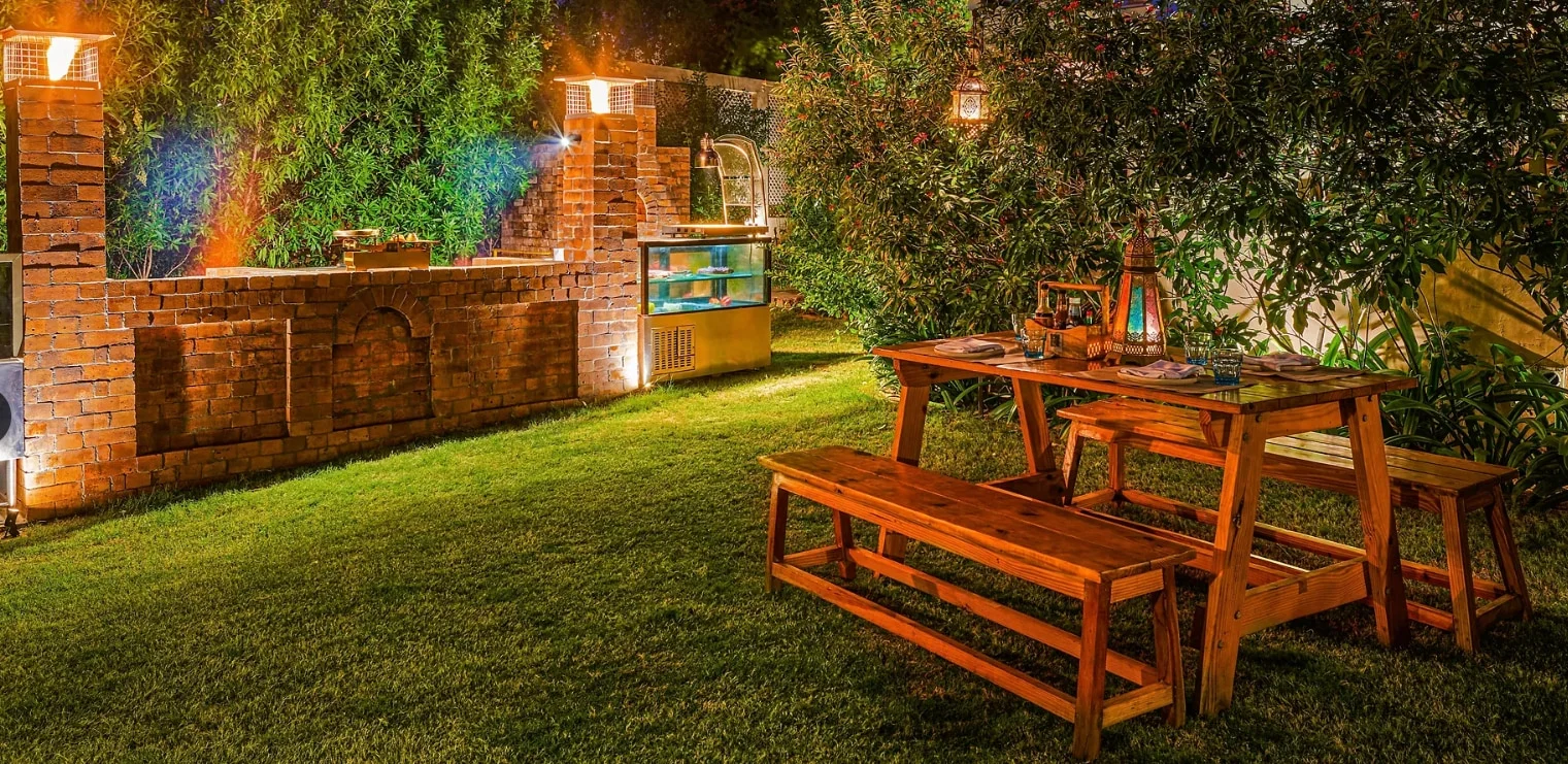 A classic Mughal-style garden with fountains and lush greenery, providing a spectacular outdoor setting for pheras or a cocktail evening.