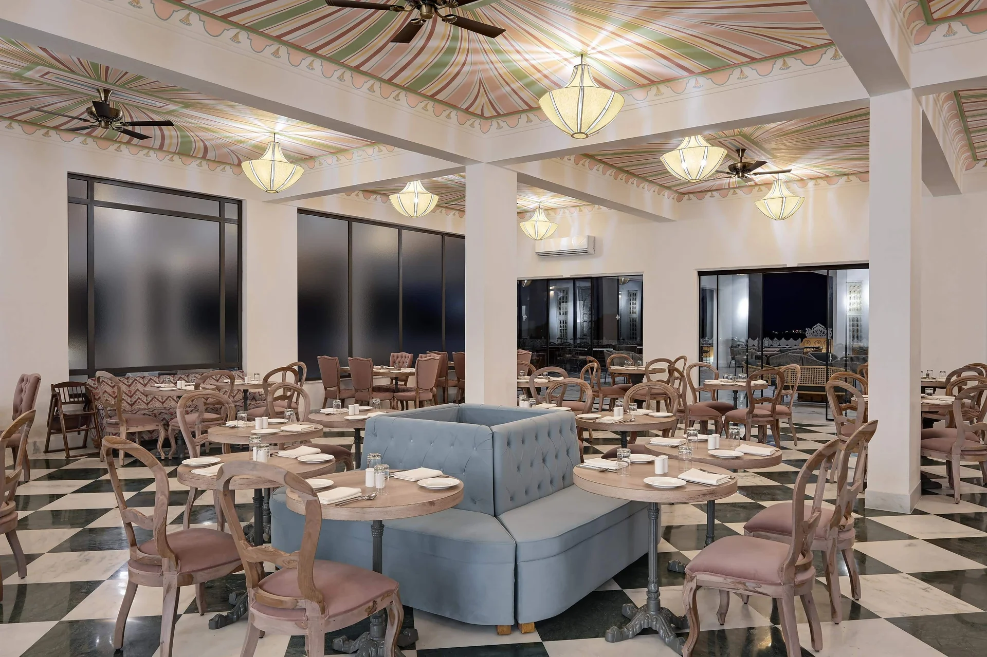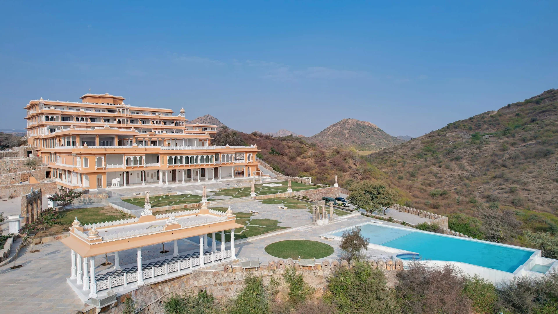Fateh Vilas is a grand tribute to the architectural heritage of Rajasthan, built with modern sensibilities. Located in the heart of Udaipur near the Celebration Mall area, this hotel stands out with its imposing white façade, grand archways, and intricate stone carvings. While it is a modern construction, it exudes a palace-like charm. It is particularly renowned for having one of the largest rooftop pool venues in the city, offering panoramic views of the Aravalli hills, making it a favorite for cocktail nights and receptions.