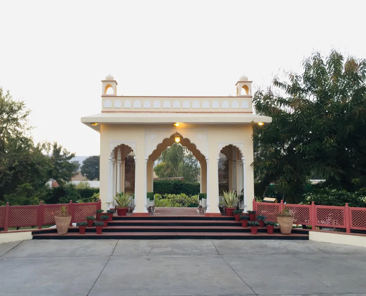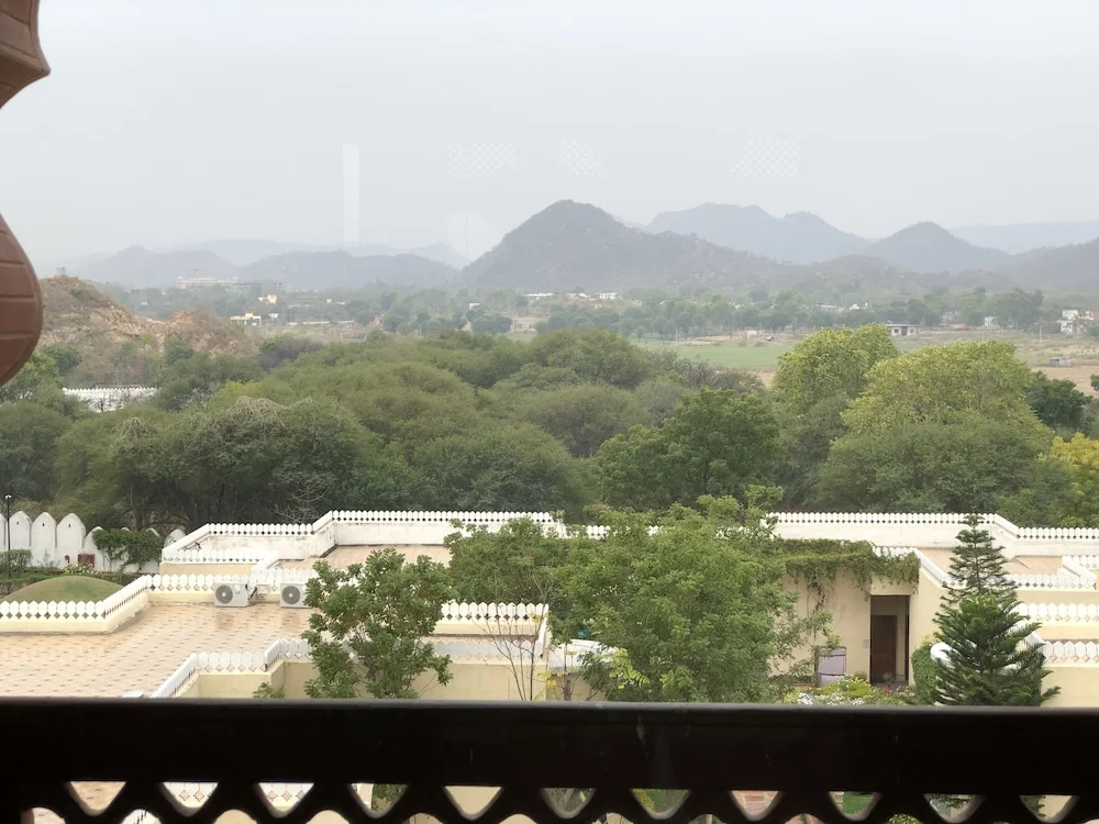 A palatial resort spread over 25 acres, paying homage to Indian architecture with peacock arches, gleaming white stone, and lush landscaped gardens.