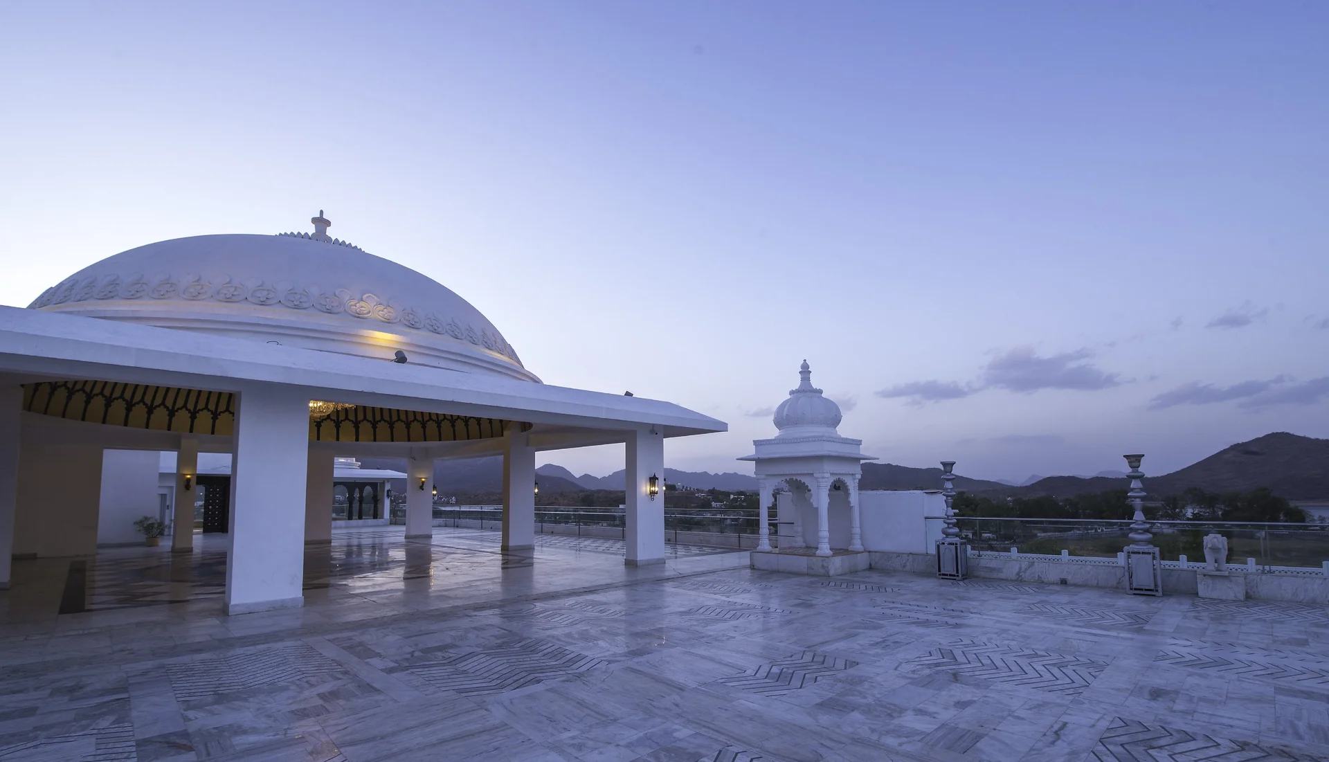 Radisson Blu Palace Resort & Spa is where modern luxury meets the architectural grandeur of Rajasthan. Located elegantly on the banks of Fateh Sagar Lake, this property looks like a white marble palace with its domes and arches. It is widely preferred for large destination weddings because it houses one of the largest room inventories in the city (245 rooms) and the biggest pillar-less ballroom. The highlight is its cascading two-tier swimming pool, which serves as a spectacular backdrop for evening functions.