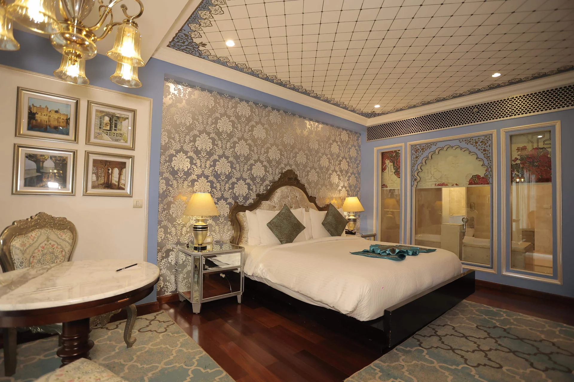 One of the largest pillar-less ballrooms in Udaipur (6,000 sq ft), featuring grand chandeliers and opulent interiors for a royal reception.