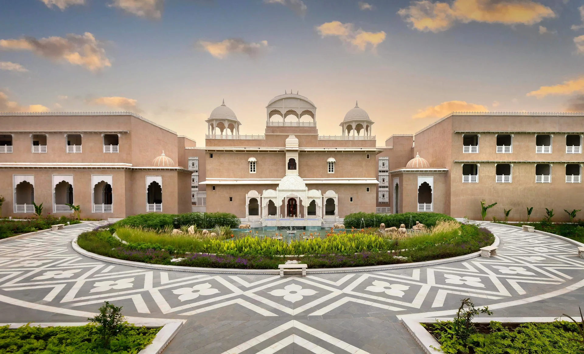 An upper-level manicured garden right in front of the palace facade, perfect for a regal Sangeet or Haldi.