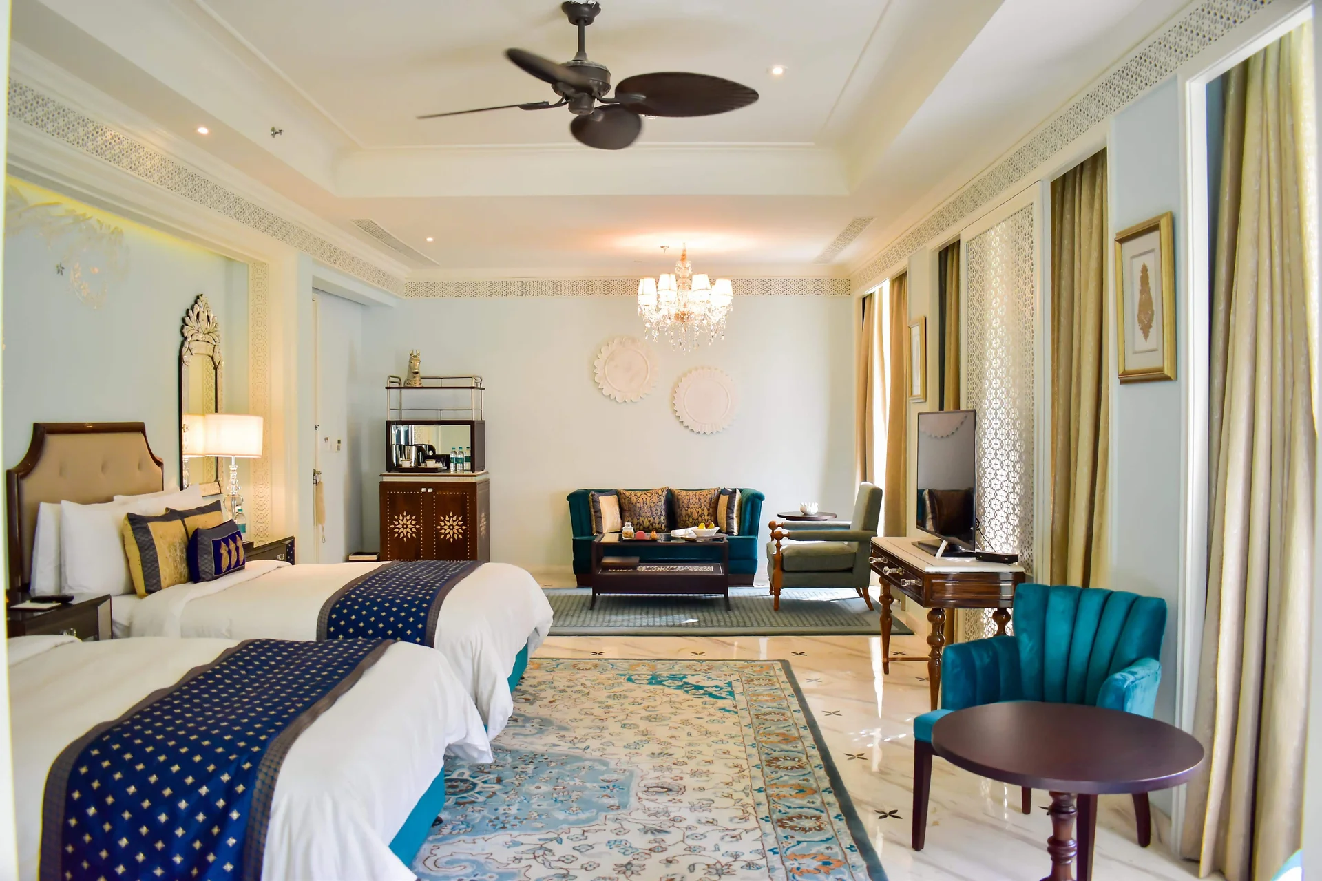 The Leela Palace Jaipur features 200 lavishly appointed rooms, suites, and villas, ensuring ample accommodation for a large wedding party.