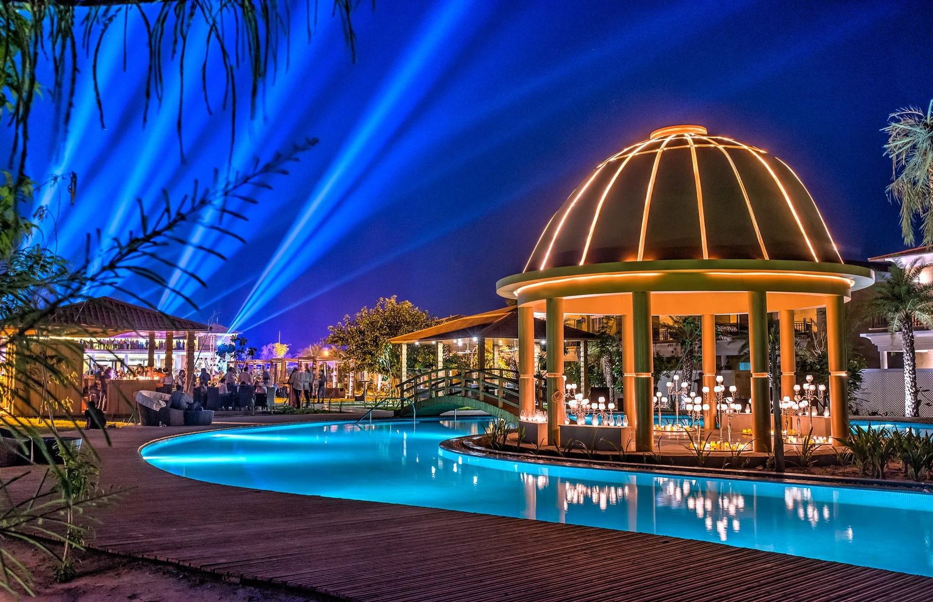 A vibrant outdoor space by the pool, ideal for a fun Haldi or Mehendi function with colorful cabanas.